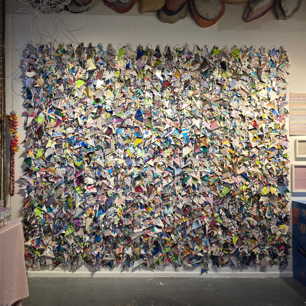 The wall installation cascades and overlaps, creating depth and movement that mirrors the actual experience of transformation. Nothing stays in its assigned place. Everything interrupts everything else. The fragments lean into each other, creating new conversations across time, new relationships between past selves and present possibilities.